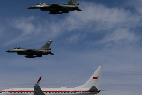 Mereka menjaga posisi dan jarak aman di sekitar pesawat kepresidenan sepanjang penerbangan, sekaligus memastikan kondisi udara tetap terkendali.